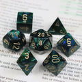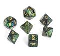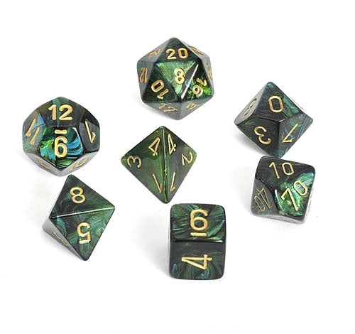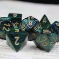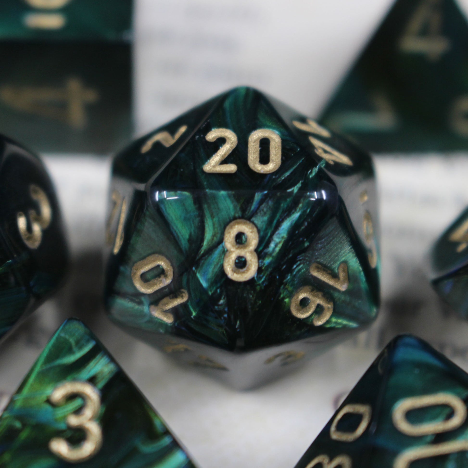 Roll the dice and unleash your inner sorcerer with this dazzling Scarab Jade 7-Dice Set. The iridescent blue and deep, dark green dice feature gold inked numbers for a mystical touch. Perfect for role-playing games like Dungeons & Dragons, this set of 7 dice will become your lucky talismans as you cast spells and battle monsters. The vivid color combination and finely inked gold numbers add a touch of style to your next dice roll, inspiring you to weave an epic tale full of magic and adventure. Each dice face feels smooth under your fingertips yet substantial enough to roll with authority across the gaming table. So gather your party and prepare for a quest - these enchanted dice are waiting to bring the drama, suspense and fun of your next campaign to life. This green dice set contains: a d4, d6, d8, d10, d%, d12, and d20.
