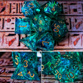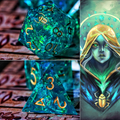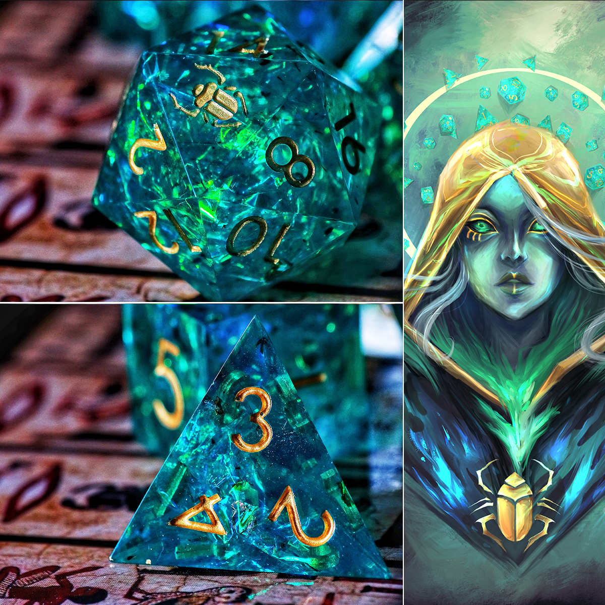 In ancient Egypt, the scarab represented renewal, rebirth, and growth. That's why we have chosen green resin for our scarab hieroglyphic dice set. This Awesome Dice exclusive set features sharp edges and metallic inclusions.
