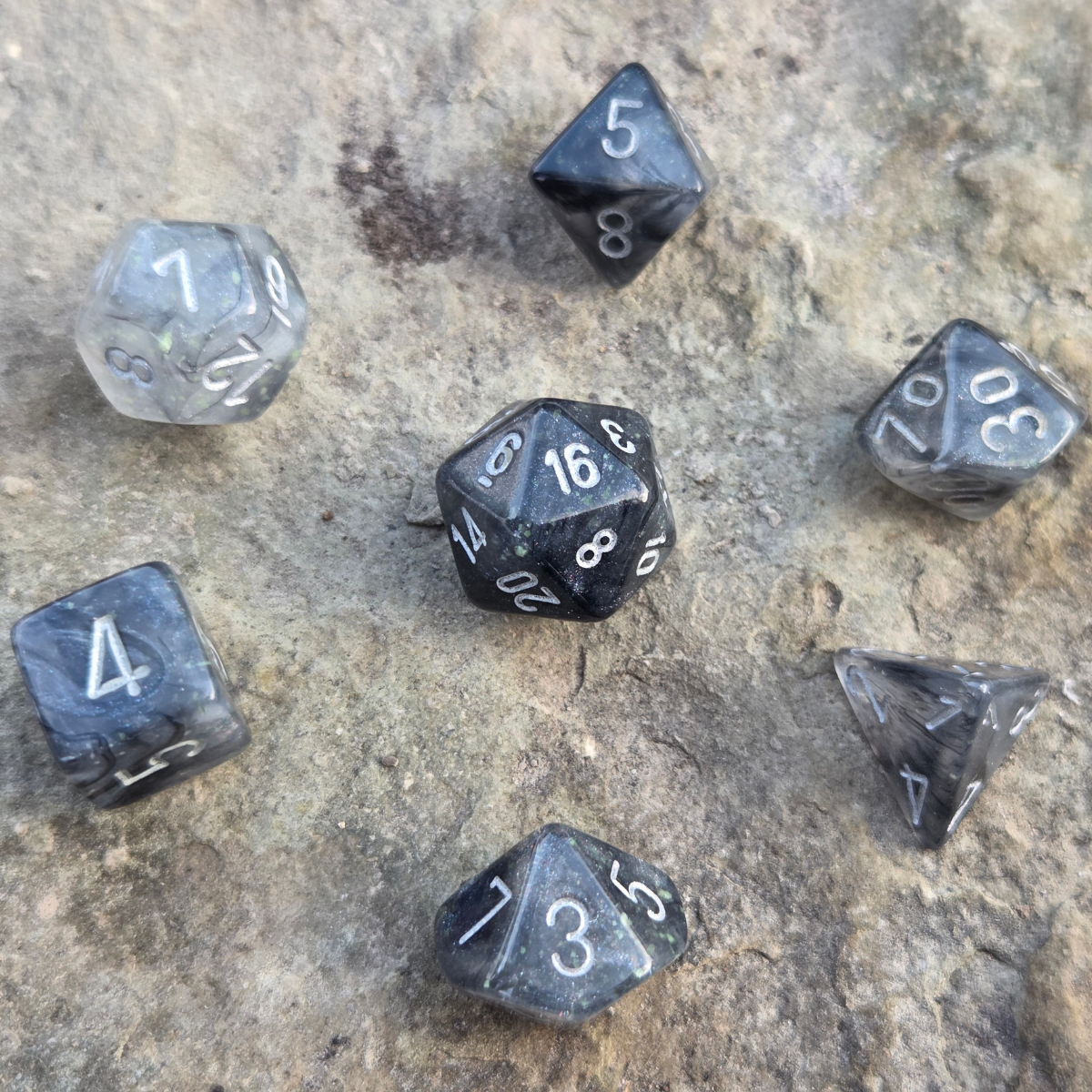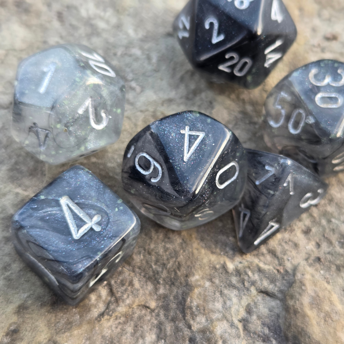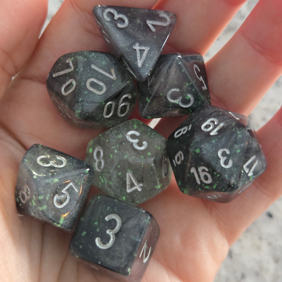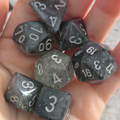 A set of Borealis Light Smoke RPG dice with silver ink and Chessex's proprietary Luminary glow in the dark glitter. This set is part of Chessex's revamped Borealis-series lineup of dice. These are standard-sized 16mm dice. Seven dice sets are ideal for Dungeons & Dragons and many other RPGs. This black and silver dice set contains one of the following: a d4, d6, d8, d10, d%, d12, and d20.