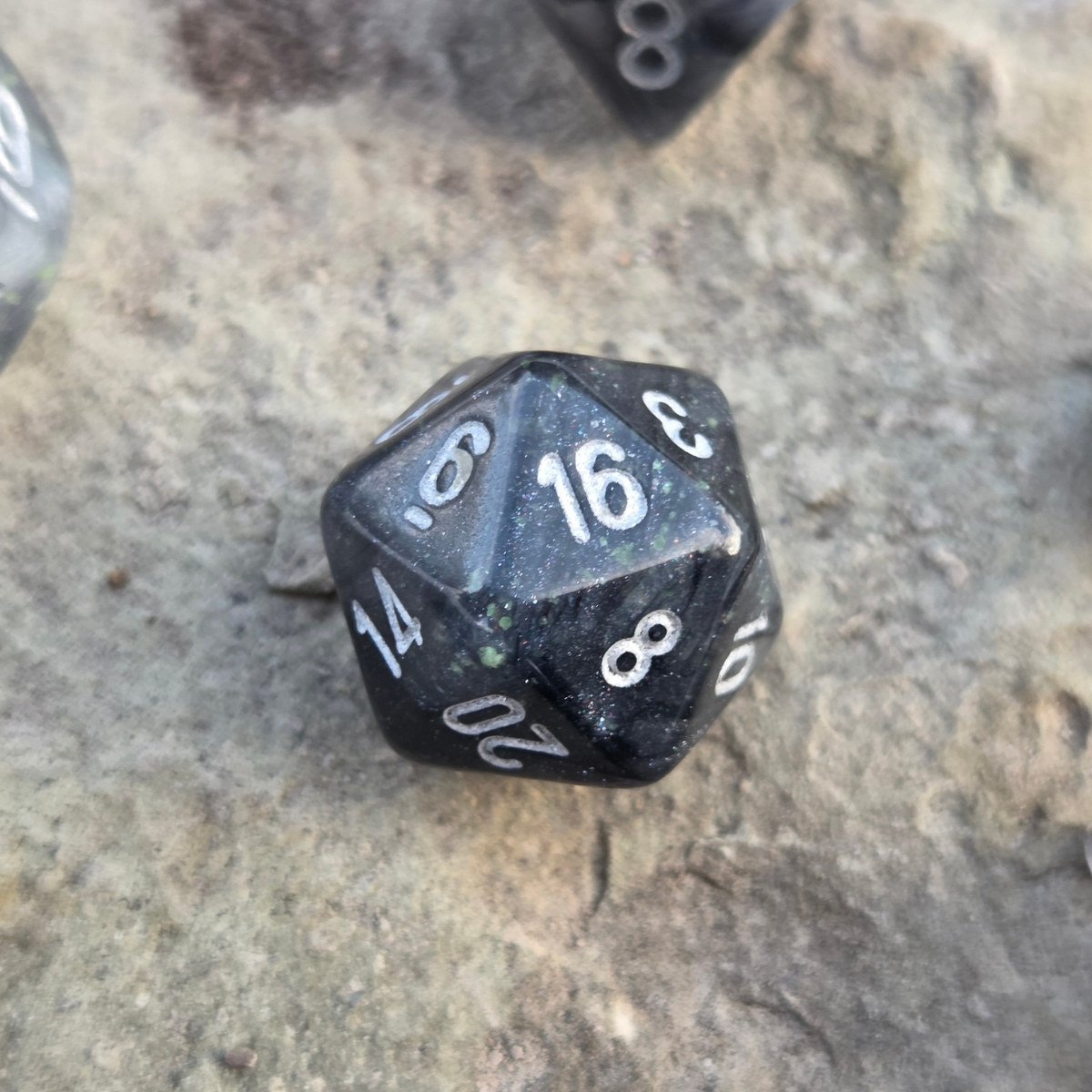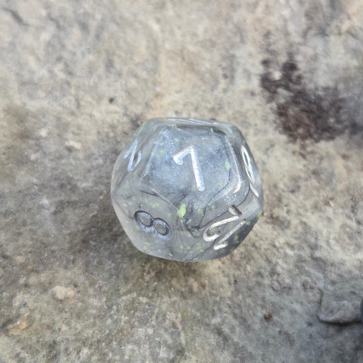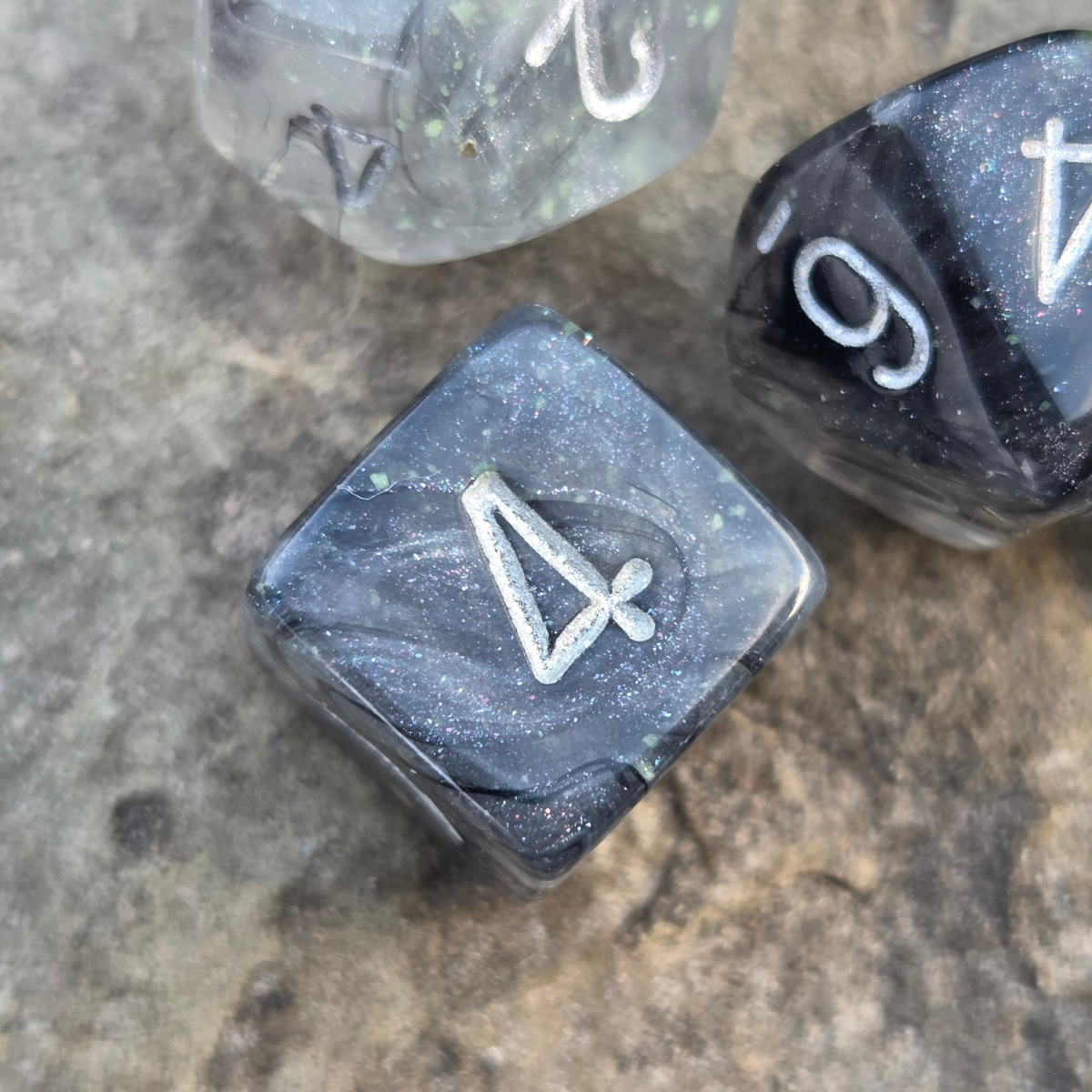A set of Borealis Light Smoke RPG dice with silver ink and Chessex's proprietary Luminary glow in the dark glitter. This set is part of Chessex's revamped Borealis-series lineup of dice. These are standard-sized 16mm dice. Seven dice sets are ideal for Dungeons & Dragons and many other RPGs. This black and silver dice set contains one of the following: a d4, d6, d8, d10, d%, d12, and d20.