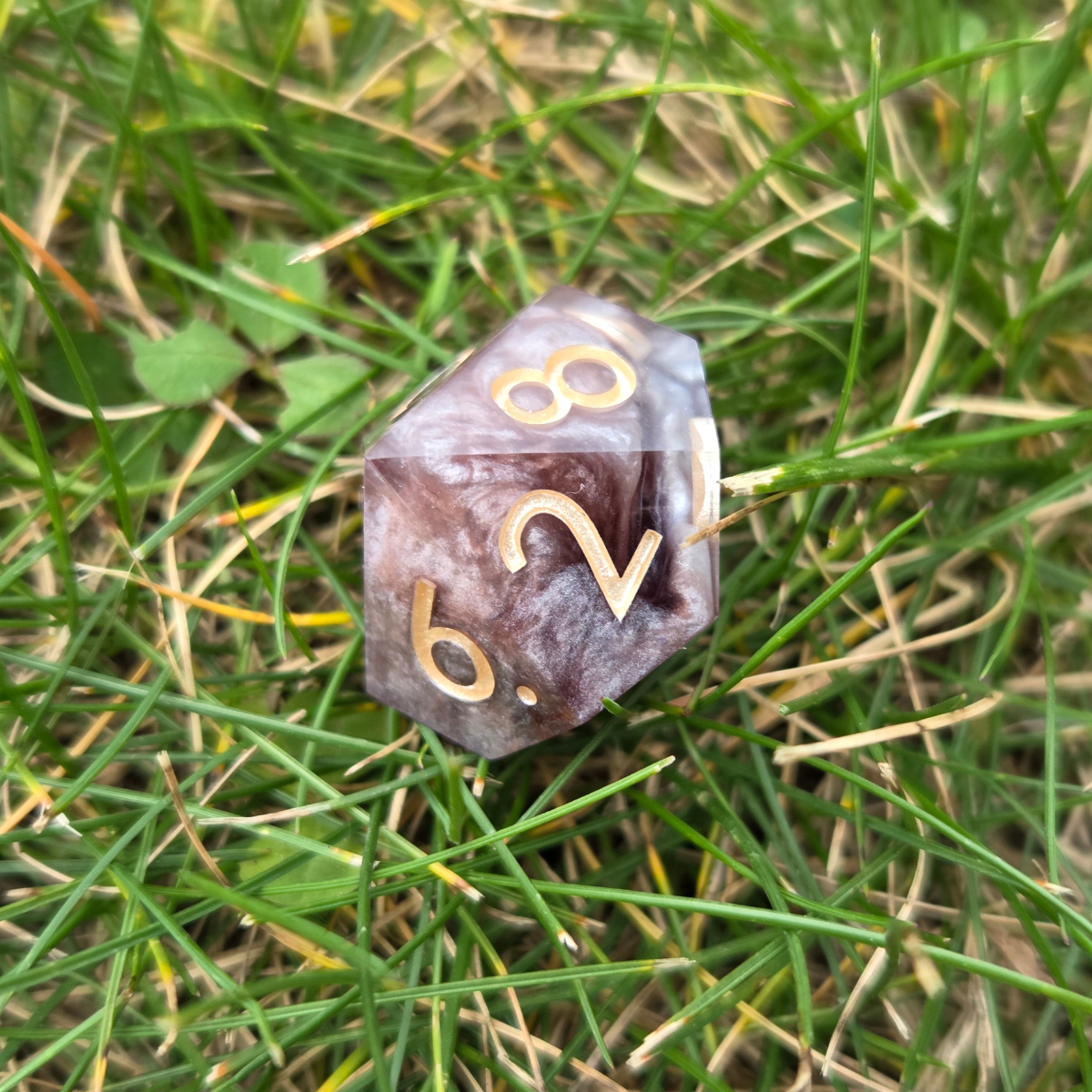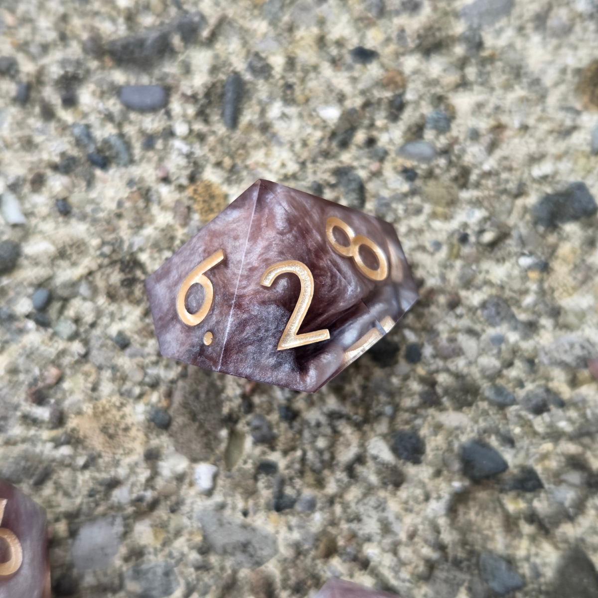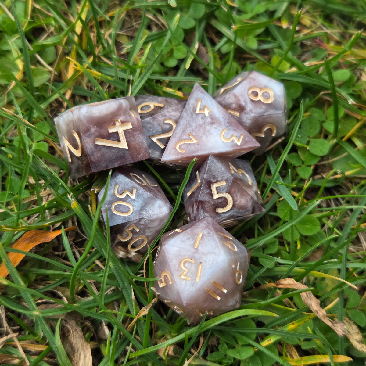 This dice set features dark brown with swirls of soft, creamy white. Inked in a soft, pale gold and easy to read, this set is handmade here in the U.S. of A. by Awesome Dice's resident dice artisan, meaning this is a one-of-a-kind set available here and nowhere else.