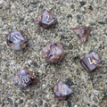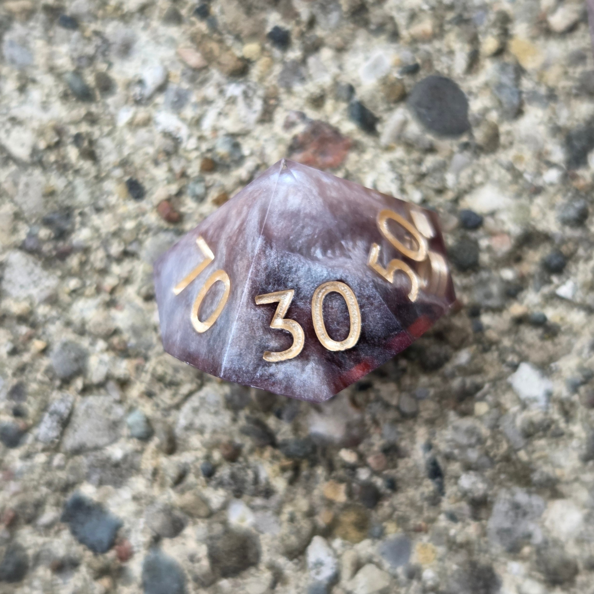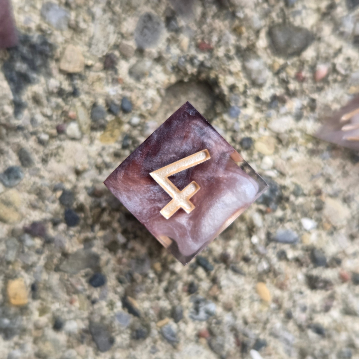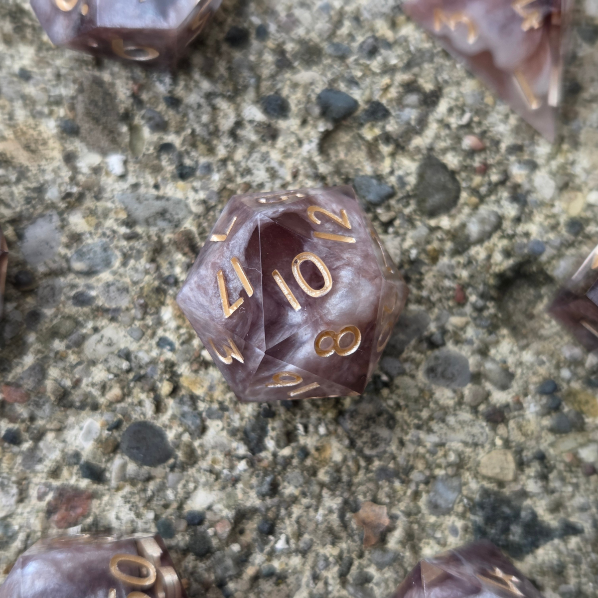 This dice set features dark brown with swirls of soft, creamy white. Inked in a soft, pale gold and easy to read, this set is handmade here in the U.S. of A. by Awesome Dice's resident dice artisan, meaning this is a one-of-a-kind set available here and nowhere else.