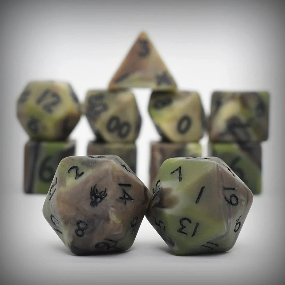 This dice set by Random Encounter Dice (R.E.D.) contains all the colors necessary to create the perfect, classic camouflage in lush, forested environments. Perfect for campaign settings in forests or woodlands and an excellent companion for rangers that call such environments home. The R.E.D. team's dragon head logo replaces the 20 on the d20.