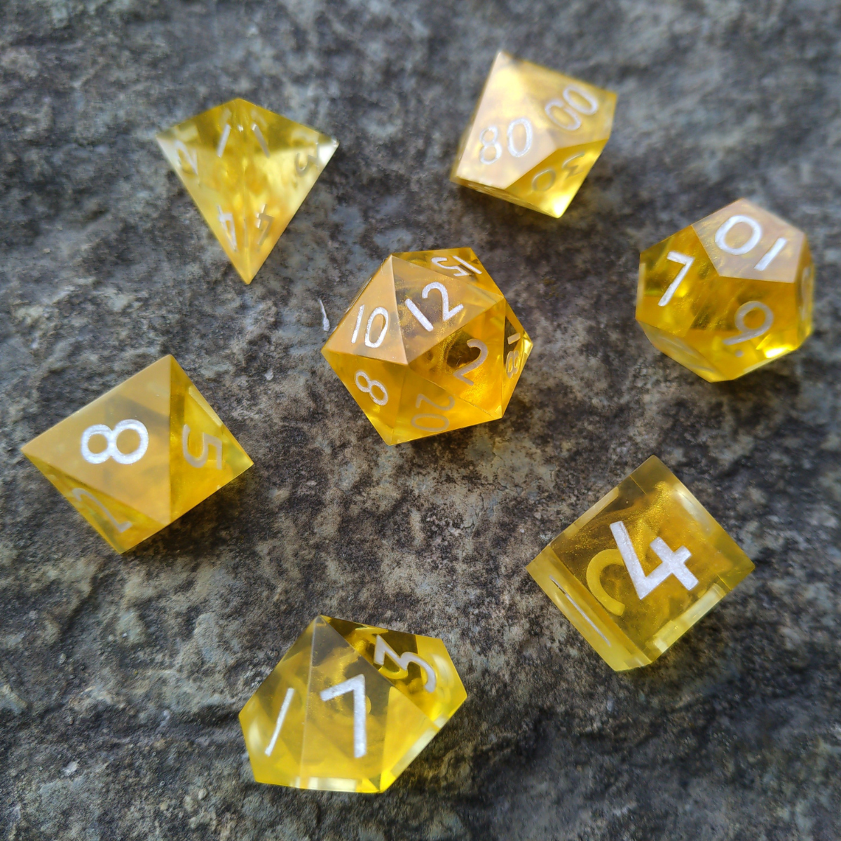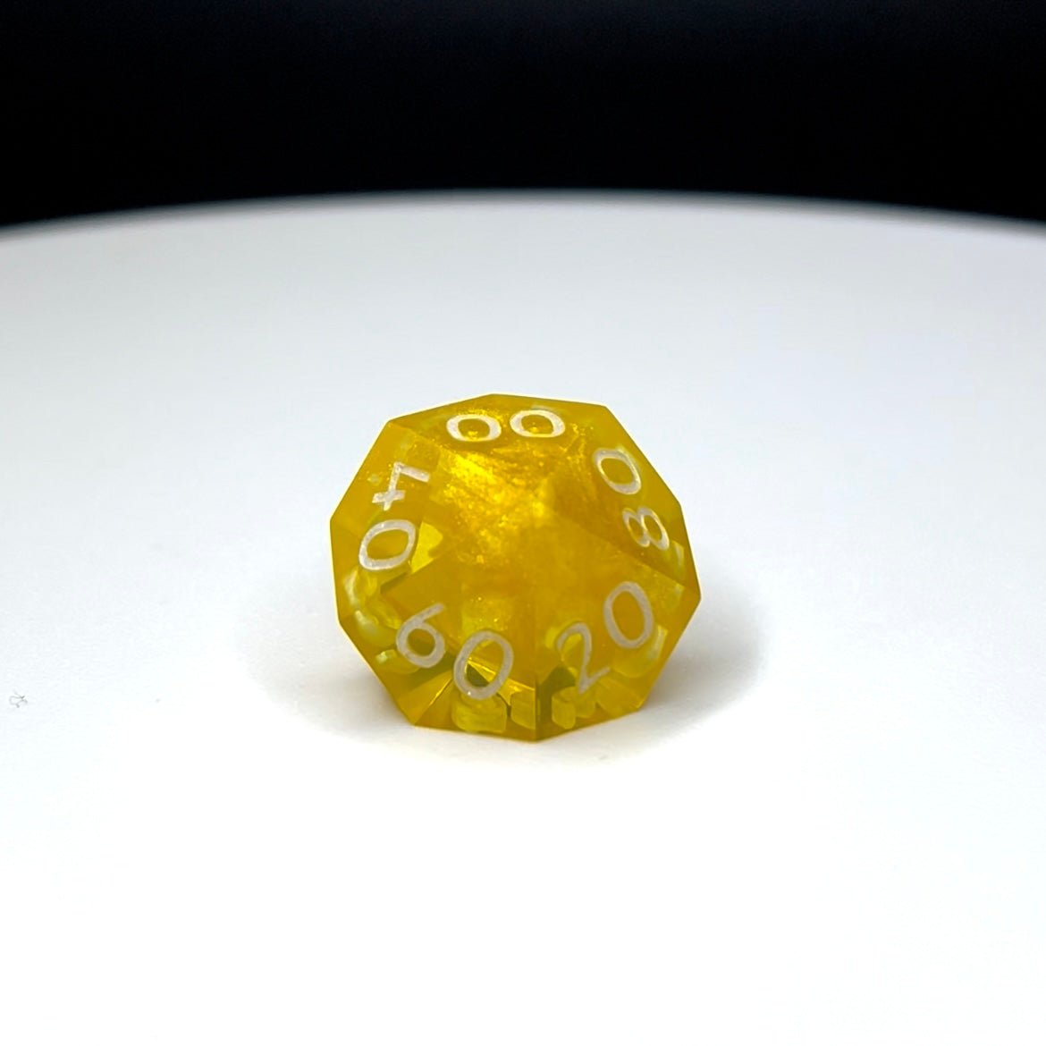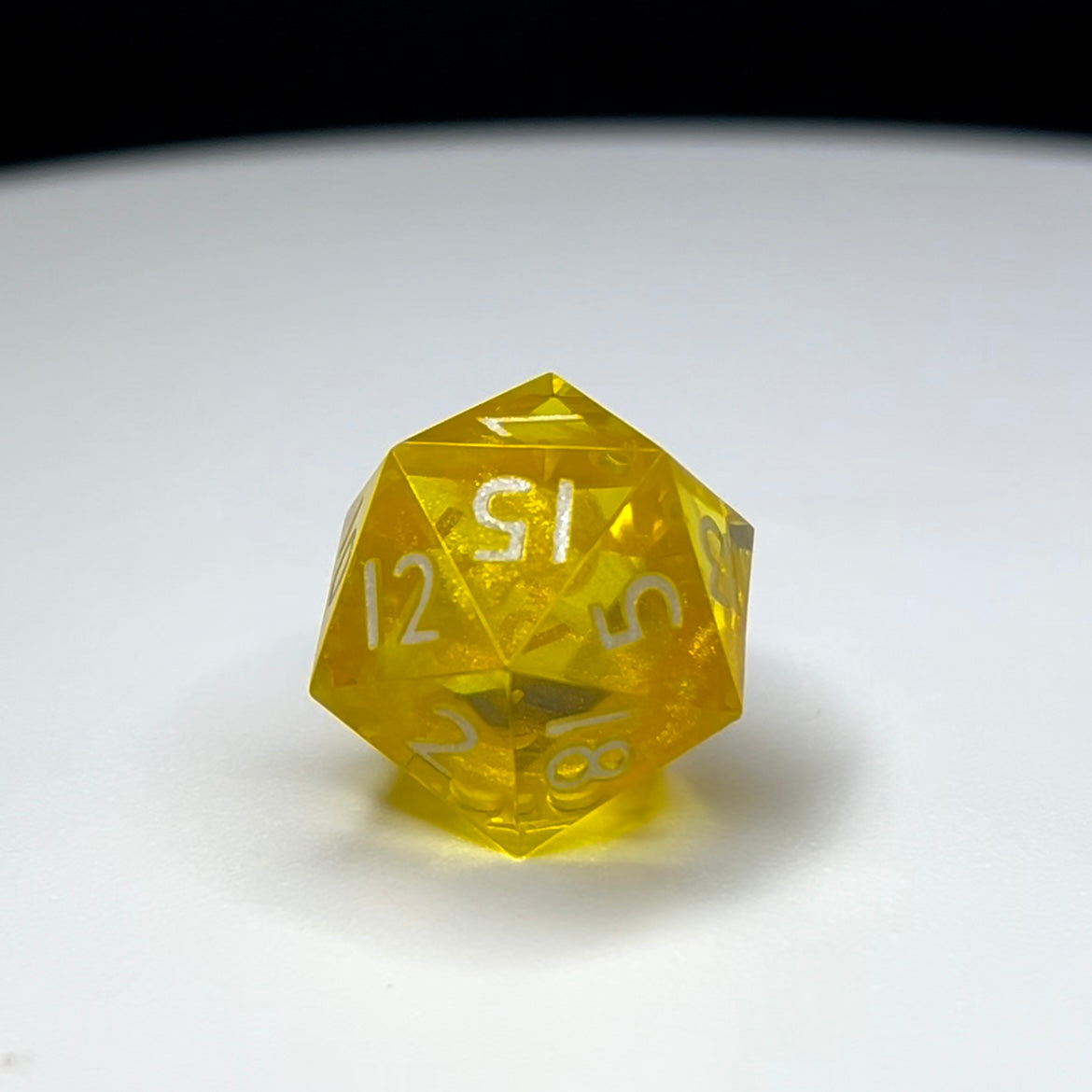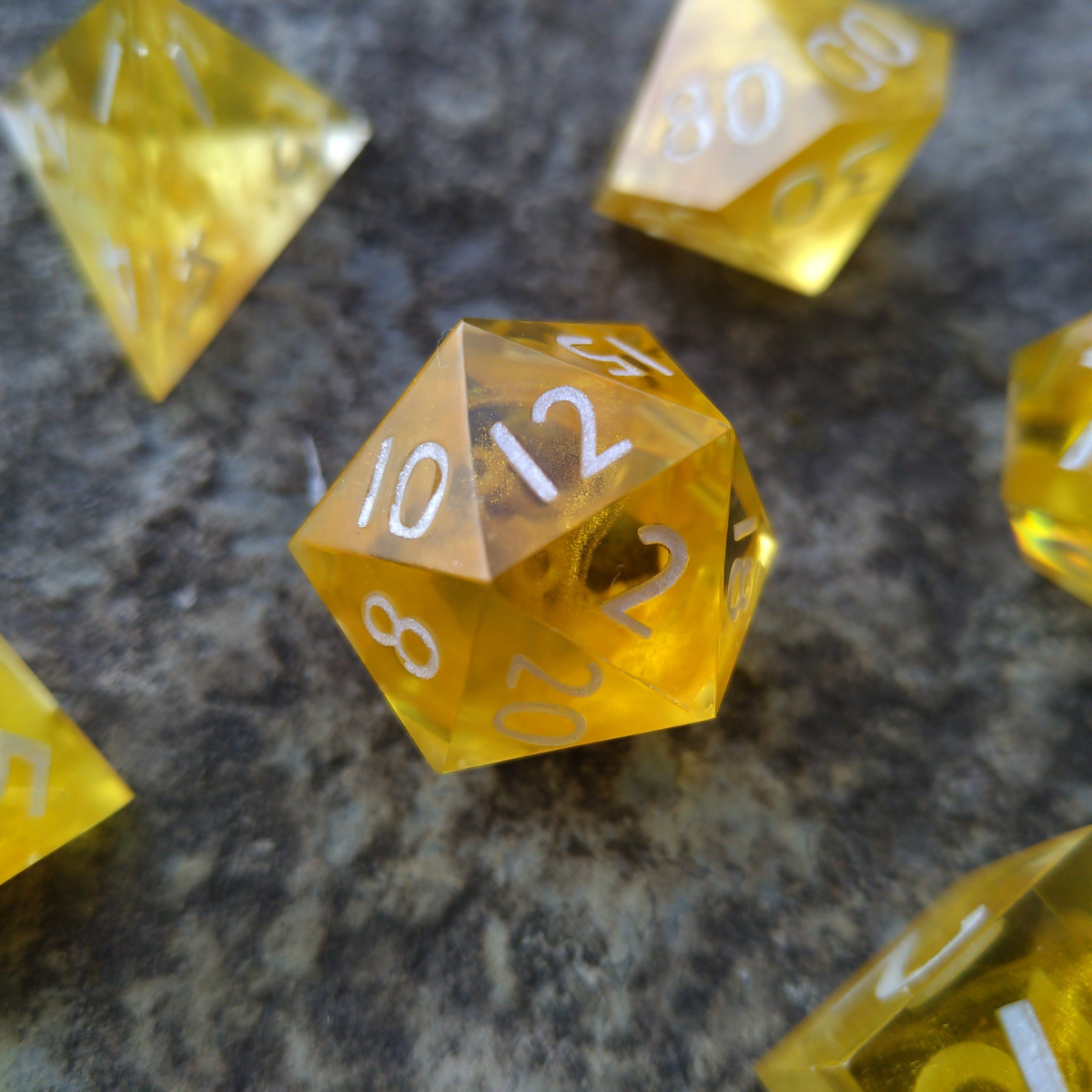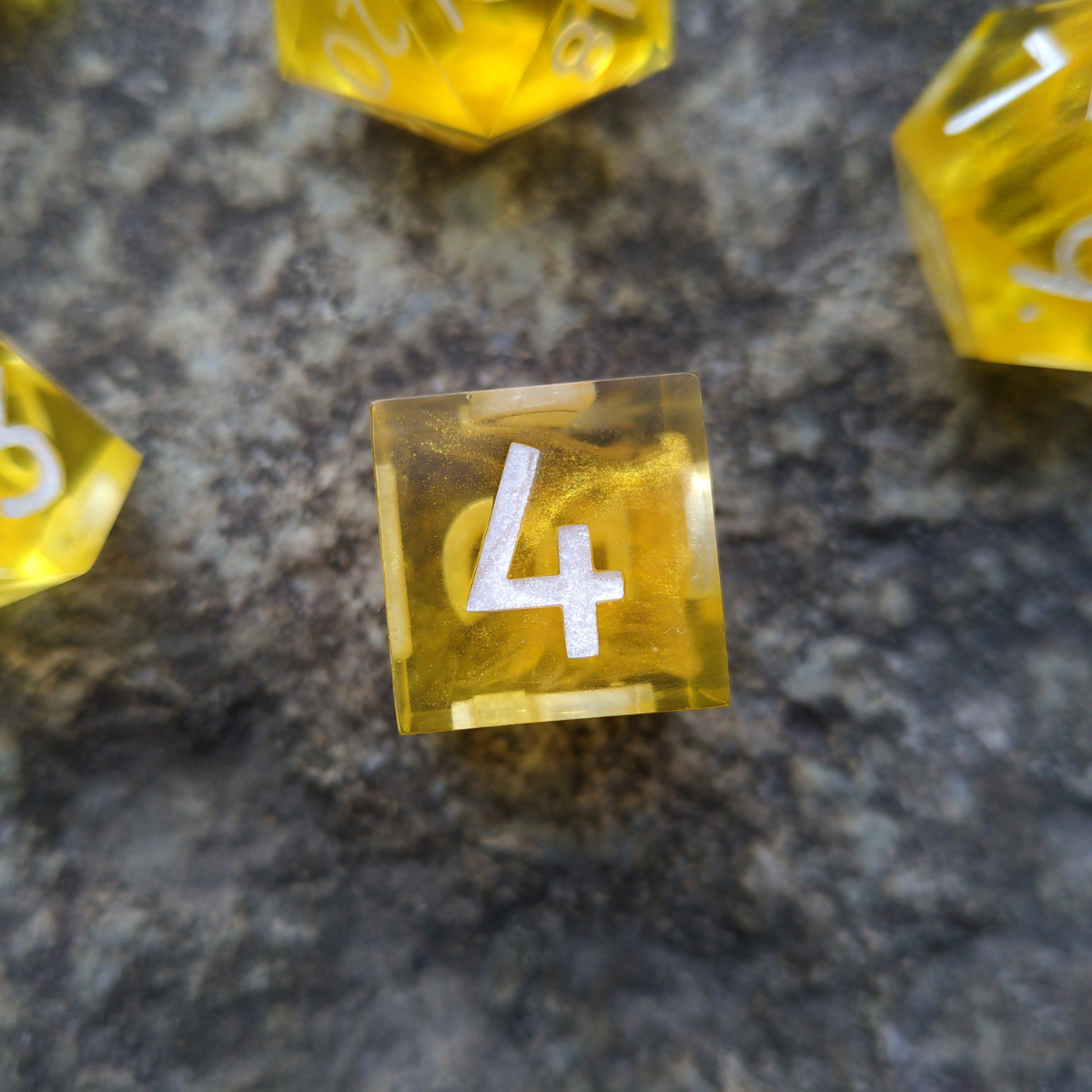 Featuring golden mica swirled within honey-yellow resin—and ink in a shimmery, bee's-wax-y white—this set was handmade here in the U.S. of A by Awesome Dice's resident dice artisan, meaning this is a one-of-a-kind set available here and nowhere else!