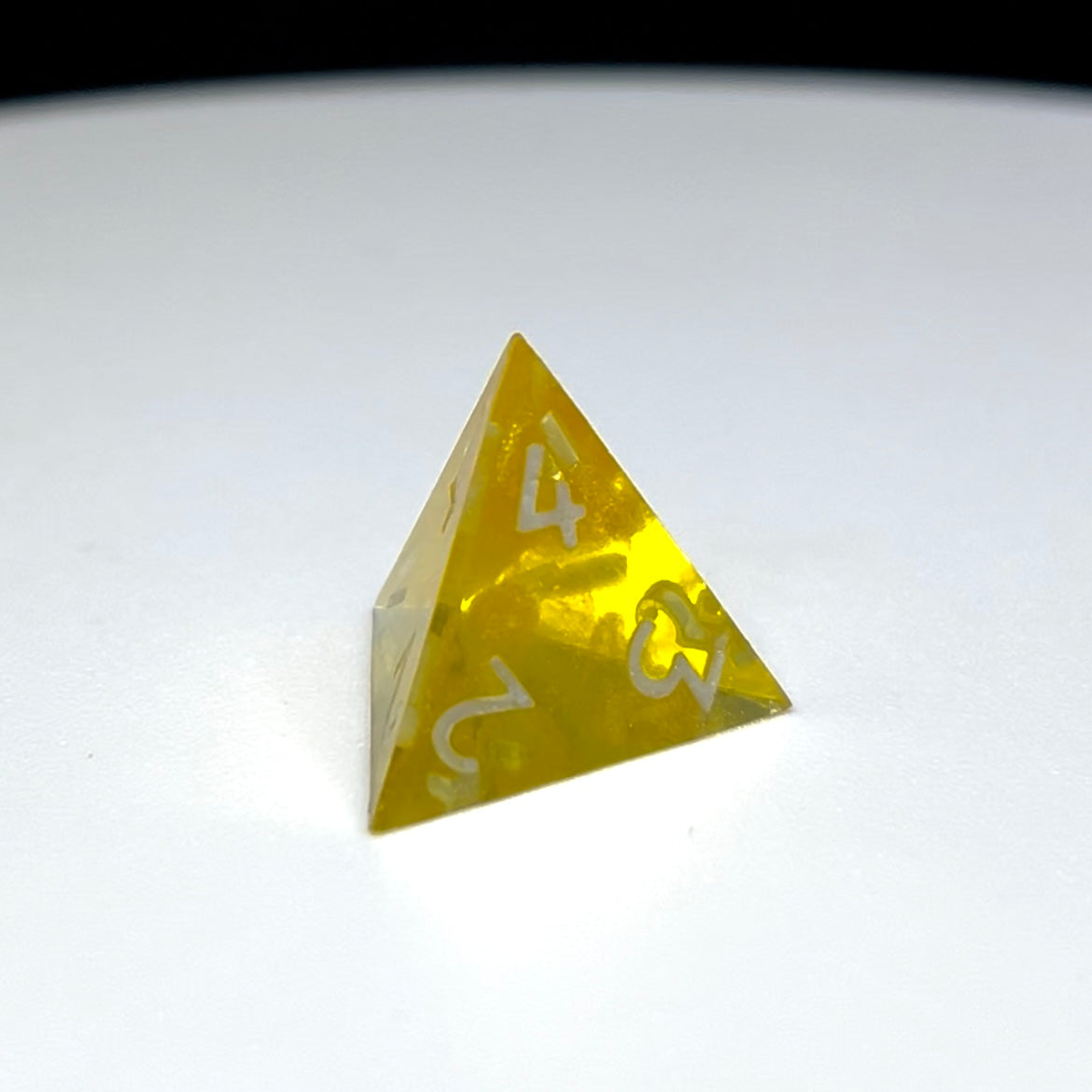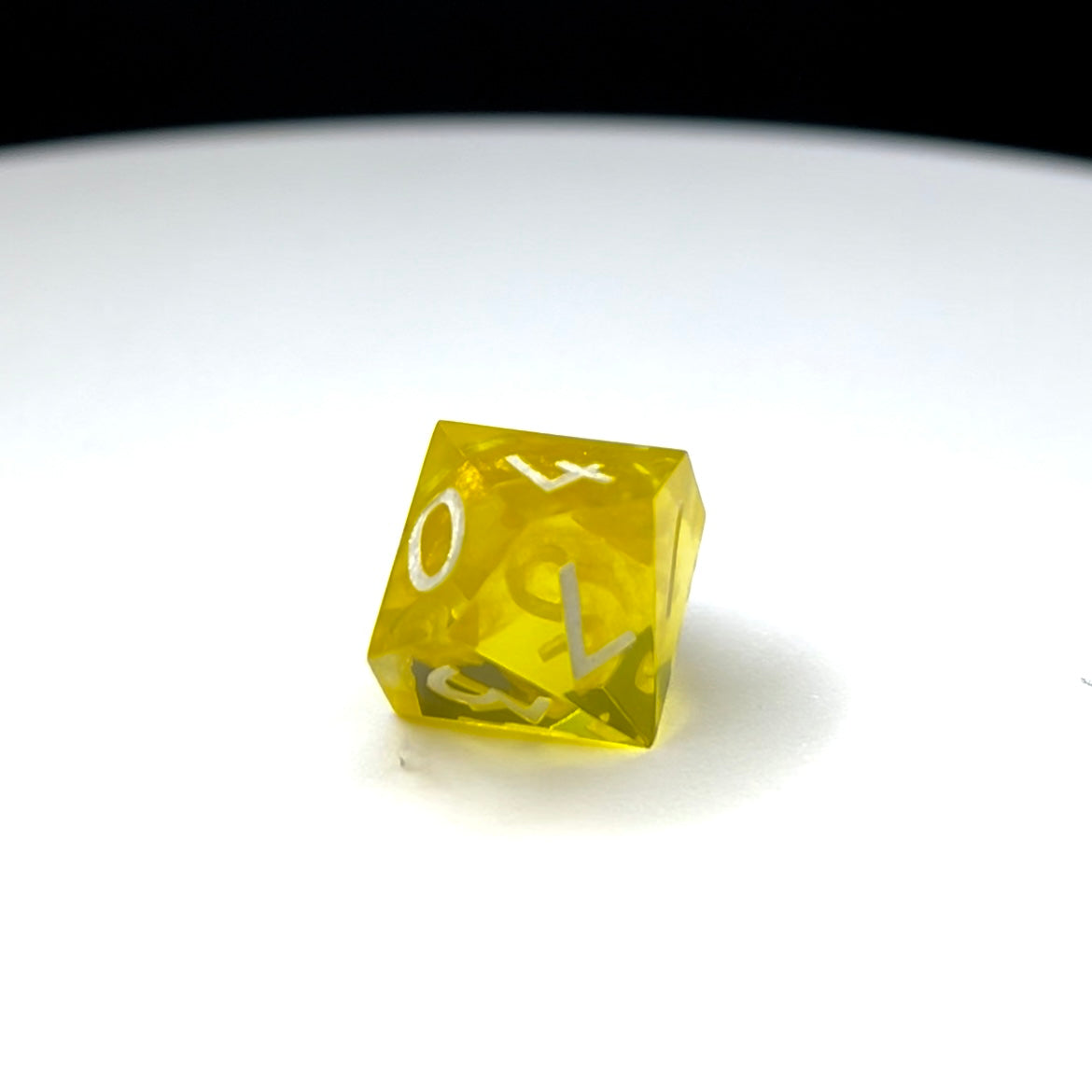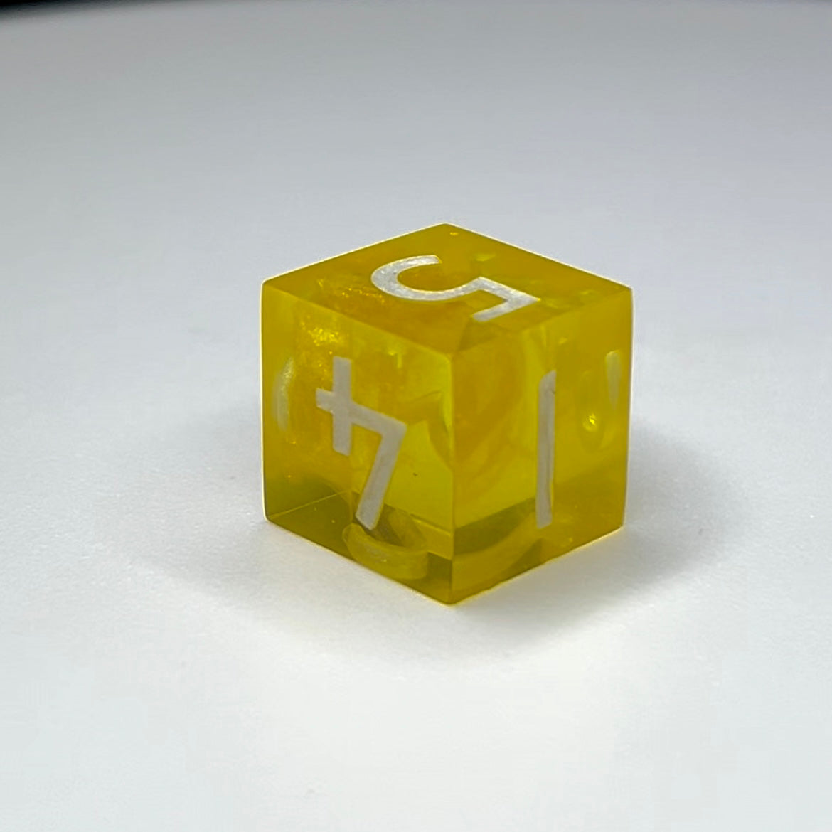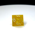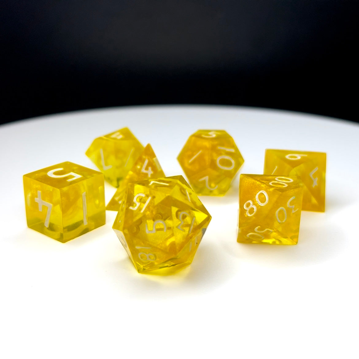 Featuring golden mica swirled within honey-yellow resin—and ink in a shimmery, bee's-wax-y white—this set was handmade here in the U.S. of A by Awesome Dice's resident dice artisan, meaning this is a one-of-a-kind set available here and nowhere else!