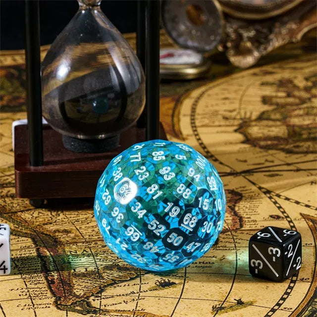Why waste effort on rolling a d% and a d10 when you can break out a d100? Also known as a Zocchihendron (named after it's inventor, Lou Zocchi, who debuted the die in 1985), this translucent blue die has the feel of a rather large, overweight golf ball.