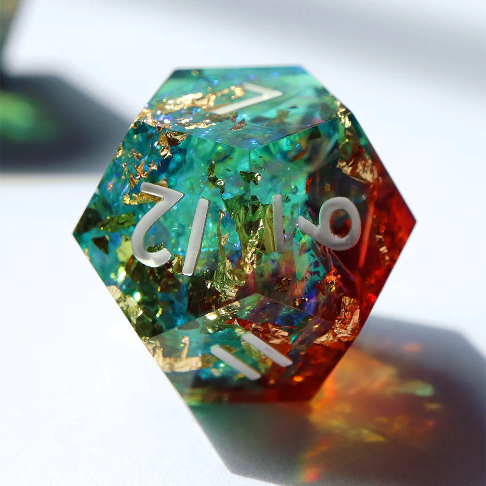 These resin dice sets are handmade by Everything Dice's team of skilled resin artisans, each die carefully inspected for both visual quality and durability, ensuring they will hold up to casual play. Each set includes a d4, d6, d8, d10, d%, d12, and d20.